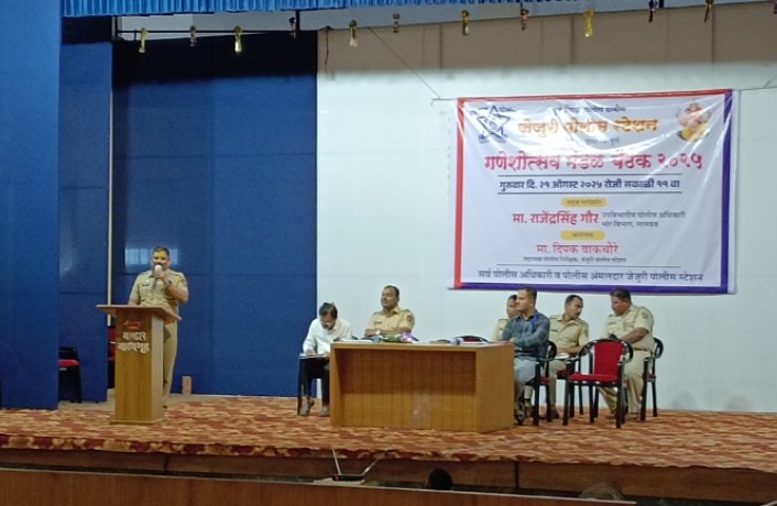 सार्वजनिक गणेशोत्सवाच्या अनुषंगाने कायदा सुव्यवस्था अबाधित राहावी यासाठी जेजुरी पोलीस स्टेशनच्या हद्दीतील गणेश मंडळाचे पदाधिकारी व कार्यकर्त्यांच्या बैठकीचे जेजुरी येथे आयोजन करण्यात आले होते.या बैठकीस जेजुरी, नीरा, वाल्हे व पंचक्रोशीतील गणेश मंडळाचे पदाधिकारी मोठ्या संख्येनं उपस्थित होते.